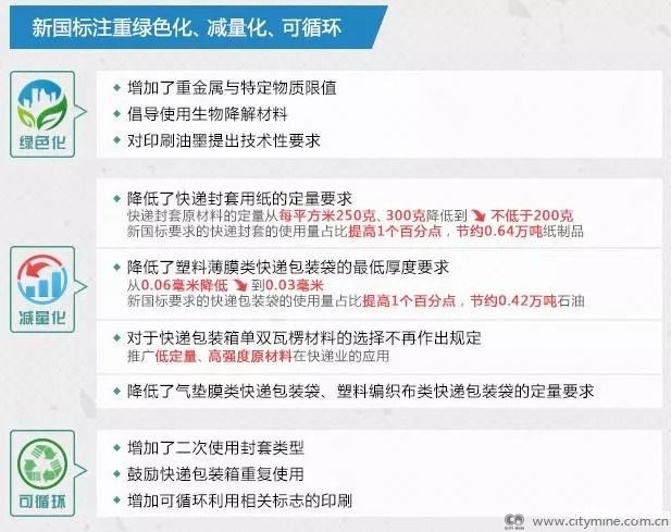 国家邮政局政策法规司司长金京华接受采访时答道,此次国标修订,“绿色化”是其重中之重。新国标结合快递包装行业实际,在此方面增加了不少内容,进行了大量创新,具体体现在以下几个方面: