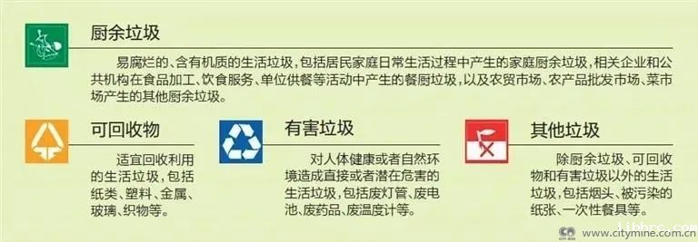 根据我市实际情况,参照国家《生活垃圾分类标志》的标准,我市将生活垃圾分为厨余垃圾、可回收物、有害垃圾、其他垃圾四类。其中厨余垃圾,是指易腐烂的、含有机质的生活垃圾,包括居民家庭日常生活过程中产生的家庭厨余垃圾,相关企业和公共机构在食品加工、饮食服务、单位供餐等活动中产生的餐厨垃圾,以及农贸市场、农产品批发市场、菜市场产生的其他厨余垃圾;可回收物,是指适宜回收利用的生活垃圾,包括纸类、塑料、金属、玻璃、织物等;有害垃圾,是指对人体健康或者自然环境造成直接或者潜在危害的生活垃圾,包括废灯管、废电池、废药品、废温度计等;其他垃圾,是指除厨余垃圾、可回收物和有害垃圾以外的生活垃圾,包括烟头、被污染的纸张、一次性餐具等。