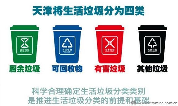 《目录》明确了天津市生活垃圾分类实施“四分类”标准,即厨余垃圾、可回收物、有害垃圾和其他垃圾四类生活垃圾。