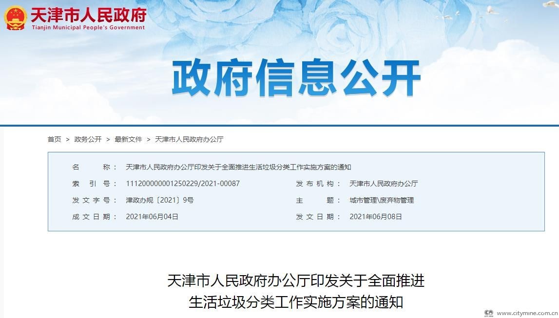 原文:天津市人民政府办公厅印发关于全面推进生活垃圾分类工作实施方案的通知
