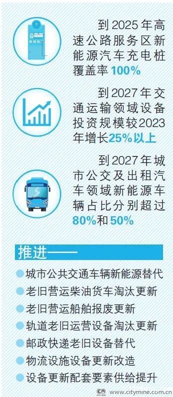 2024年07月16日 近日,天津市交通运输委等14部门印发《天津市交通运输大规模设备更新实施方案》(以下简称《实施方案》),提出到2027年,全市交通运输领域设备投资规模较2023年增长25%以上、城市公交及出租汽车领域新能源车辆占比分别超过80%和50%、国三及以下中重型排放标准营运柴油货车基本淘汰等目标。本次发布的《实施方案》明确了推进城市公共交通车辆新能源替代、老旧营运柴油货车淘汰更新、老旧营运船舶报废更新、轨道老旧运营设备淘汰更新、邮政快递老旧设备替代、物流设施设备更新改造、设备更新配套要素供给提升等七方面的重点任务。例如,在公共交通车辆方面,到2027年,新能源公交占比超过80%,出租汽车领域新能源车辆占比超过50%;在配套基础设施建设方面,持续推进绿色续航行动,到2025年实现高速公路服务区新能源汽车充电桩覆盖率100%。