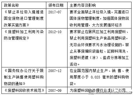 由于废弃塑料难以处理,分解困难,大量混于生活垃圾中的塑料已严重影响人类生存环境,而废旧塑料回收处理利用作为一项节约能源、保护环境、经济效益明显的措施,已受到中国政府重视。自2007年以来,中国政府将塑料回收处理行业作为环保领域的重要发展方向,出台了多项政策规范塑料回收企业废物排放,引导塑料回收处理行业可持续发展。